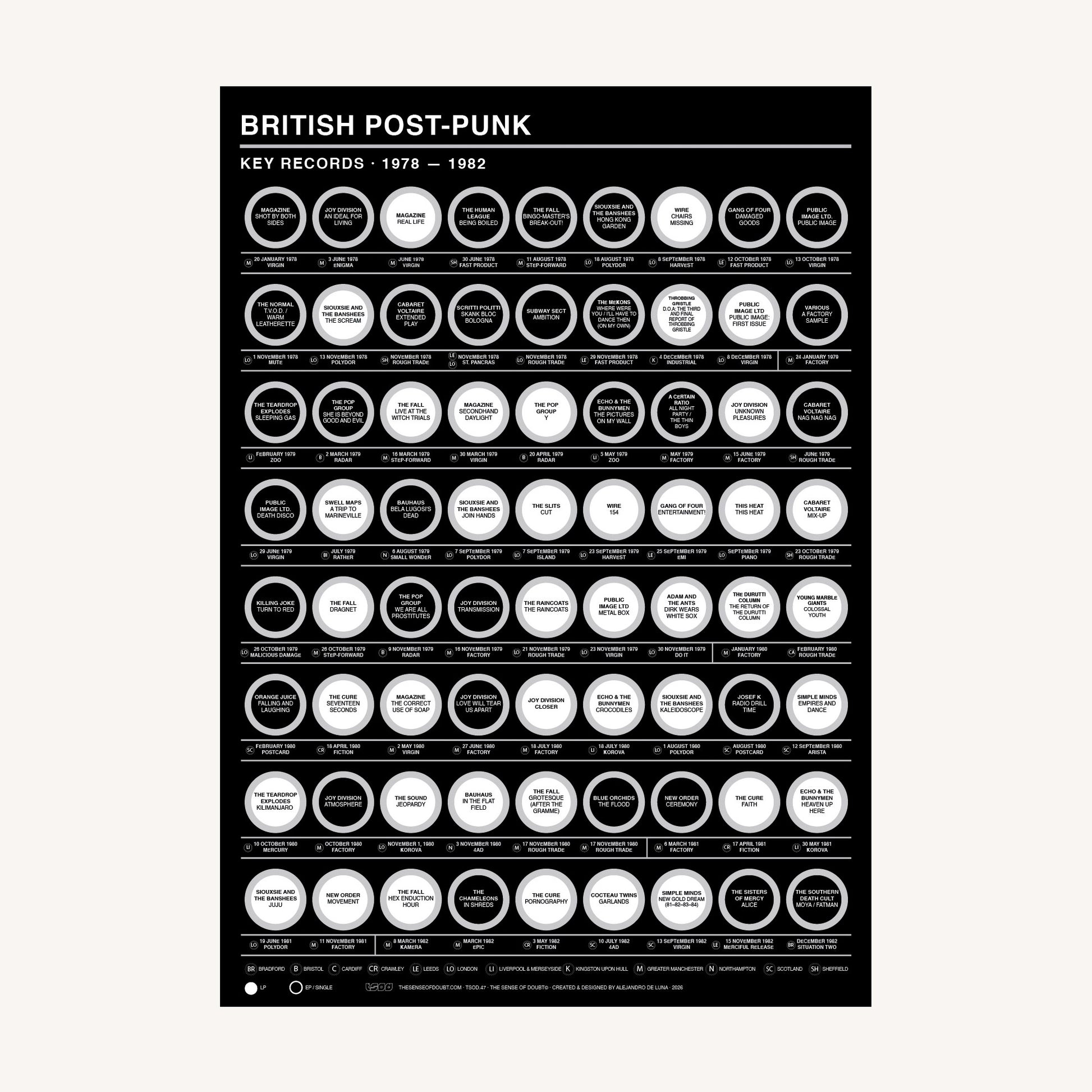 This print maps key British post-punk releases in chronological order from 1978 to 1982, presenting the period as a coherent cultural moment rather than a loose genre label. It brings together essential singles and LPs by Magazine, Public Image Ltd., Siouxsie and The Banshees, Wire, The Fall, The Pop Group, Joy Division, The Cure, Bauhaus, and Echo & The Bunnymen, alongside equally vital releases by less-celebrated groups such as Swell Maps, Subway Sect, This Heat, and others.