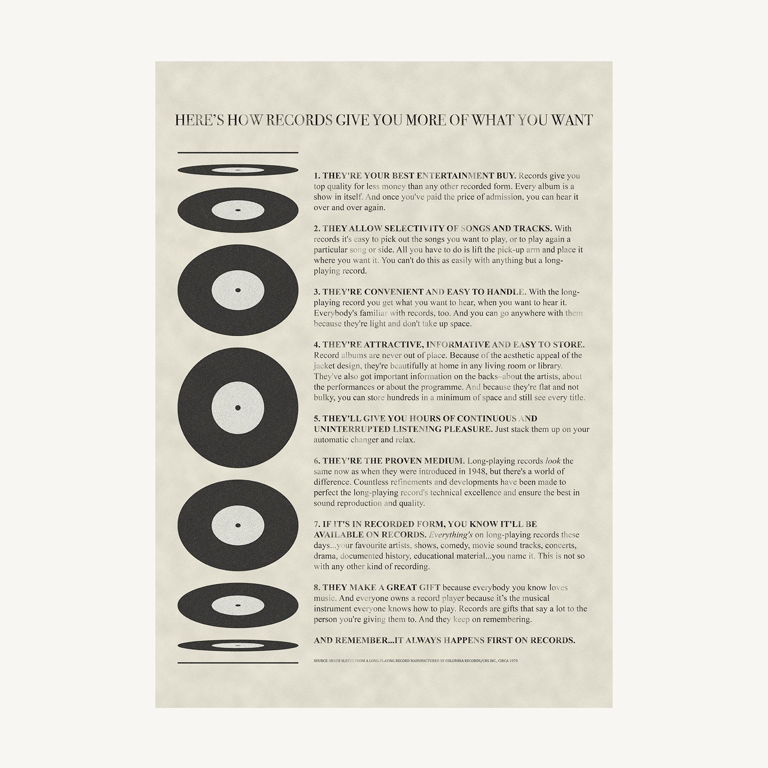 Inspired by the original inner sleeves used by CBS Records in the late 1960s and early 1970s, this piece faithfully recreates the typography, tone, and spirit of that era. The headline, “Here's How Records Give You More Of What You Want,” reflects a period when music was something you lived with—played deliberately, cared for, and returned to again and again.
